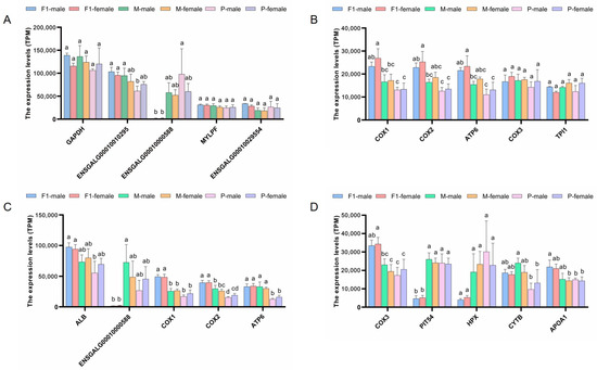 By summing and sorting the expression of each transcript in the breast muscle and liver tissues of each individual in the paternal line, maternal line, and F1 hybrids, we found that the top 10 transcripts with the highest expression levels in the breast muscle corresponded to GAPDH, ENSGALG00010010295, ENSGALG00010000588, MYLPF, ENSGALG00010029554, COX1, COX2, ATP6, COX3, and TPI1 (Figure 2A,B). The top 10 genes in the liver were ALB, ENSGALG00010000588, COX1, COX2, ATP6, COX3, PIT54, HPX, CYTB, and APOA1 (Figure 2C,D). Additionally, ENSGALG00010000588, COX1, COX2, ATP6, and COX3 were highly expressed in both breast muscle and liver. In particular, the mRNA level of ENSGALG00010000588 in both breast muscle and liver tissues of the F1 cross was significantly lower than that in both the paternal line and maternal line. Furthermore, the PIT54 gene in the liver showed a similar expression trend. In both tissues, no significant difference was observed in the expression levels of these genes between males and females within the same group.