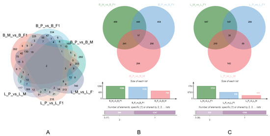 The number of DEGs in all groups (A), breast muscle (B), and liver (C). B_M_vs_B_F1: breast muscle, maternal line vs. F1 cross; B_P_vs_B_F1: breast muscle, paternal line vs. F1 cross; B_P_vs_B_M: breast muscle, paternal line vs. maternal line; L_M_vs_L_F1: liver, maternal line vs. F1 cross; L_P_vs_L_F1: liver, paternal line vs. F1 cross; L_P_vs_L_M: liver, paternal line vs. maternal line.