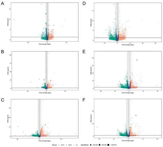 Meanwhile, the upregulation and downregulation of these DEGs were further analyzed. The results revealed that in the liver, there were 300 upregulated and 169 downregulated DEGs in the comparison between the paternal line and maternal line (Figure 4A), 610 upregulated and 310 downregulated DEGs in the comparison between the paternal line and F1 cross (Figure 4B), and 902 upregulated and 849 downregulated DEGs in the comparison between the maternal line and F1 cross (Figure 4C). In addition, our results showed that the numbers of upregulated and downregulated DEGs of the paternal line vs. maternal line, paternal line vs. F1 cross, and maternal line vs. F1 cross in breast muscle were 475 and 283 (Figure 4D), 491 and 635 (Figure 4E), and 481 and 725 (Figure 4F).