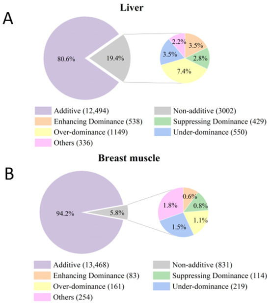 In this study, a total of 15,496 candidate genes in the liver tissue and 14,299 candidate genes in the breast muscle tissue were detected for subsequent gene expression pattern analysis, based on their expression in more than 50% of individuals within each tissue. There were 3002 genes in the liver and 831 genes in the breast muscle expressed differentially between the F1 cross and MPV (Figure 5). These genes, which comprised 19.4% and 5.8% of the candidate genes from the liver and breast muscle, were identified as non-additive genes. Thus, most genes in F1 chicken post-hatch breast muscle and liver exhibit additive expression patterns. Genes exhibiting non-additive expression patterns can be further classified into dominance (including enhancing dominance and suppressing dominance), over-dominance, and under-dominance. Specifically, the number of genes showing enhancing dominance, suppressing dominance, over-dominance, and under-dominance in the liver is 538, 429, 1149, and 550, respectively. As for breast muscle, the number of genes exhibiting these non-additive expression patterns is 83, 114,161, and 219, respectively. Overall, these results indicate that additivity is the predominant gene expression pattern in F1 chicken post-hatch breast muscle and liver.