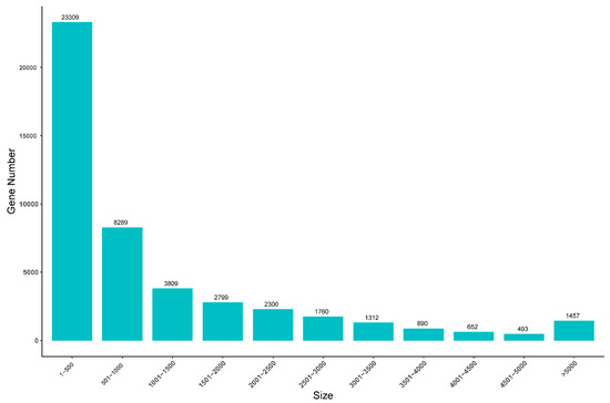 Using the Illumina Novaseq6000 (Illumina, San Diego, CA, USA) high-throughput sequencing platform, the obtained cDNA libraries were sequenced according to the Pair-End 150 (PE150) sequencing strategy. For each library, the sequencing data were larger than 6 Gb. The Illumina high-throughput sequencing results were initially presented as raw image data, which needed to be converted into raw reads by Base Calling using CASAVA software version 1.8. Then, Fastp v0.20.1 software was applied to identify and discard splice sequences and low-quality sequences to generate high-quality clean reads using the parameters “-l 150 -q 20” [19]. Based on the clean reads, F1 sequencing data were selected to perform de novo assembly. The Trinity platform was used to assemble the transcriptome sequencing data through Inchworm, Chrysalis, and Butterfly [20]. Then, BUSCO v5.2.2 was applied to evaluate the integrity of the transcriptome assembly [21].