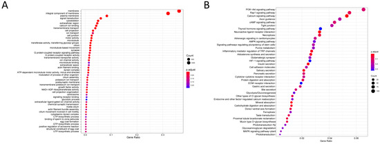 The gene expression levels in the testes and ovaries were calculated based on the FPKM values. In total, 3528 upregulated genes and 3154 downregulated genes were found in the testes (Figure 4A). All DEGs with a |log2FC| > 2 and a p value < 0.05 are visually displayed in the volcano plot (Figure 4B). In addition, the top 50 GO classifications and 40 KEGG pathways are shown in Figure 5. Among the KEGG pathways, the significantly enriched pathways included the calcium signaling pathway, the neuroactive ligand–receptor interaction, mineral absorption, insulin secretion, aldosterone synthesis and secretion, salivary secretion, inflammatory mediator regulation of TRP channels, carbohydrate digestion and absorption, and proximal tubule bicarbonate reclamation (Figure 5B).