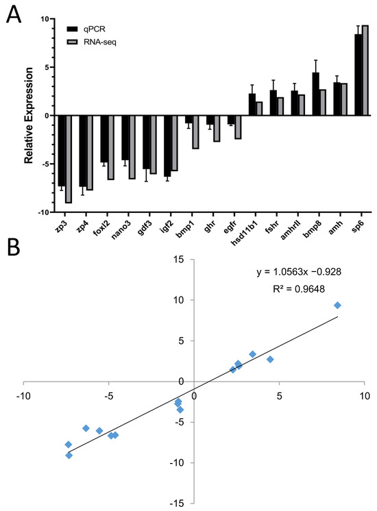To validate the expression profiles of the DEGs, nine female-biased and six male-biased genes were separately chosen for qRT-PCR analysis. The results showed that the expression of all DEGs validated by qRT-PCR was completely consistent with the results from the transcriptome data (Figure 6). The expression of DEGs including amh, amhrII, cyp27a1, bmp8, and sp6 was male-biased, while the expression of DEGs such as zp4, zp3, foxl2, nanos3, gdf3, igf2, bmp1, and egfr was female-biased (Figure 6A). Moreover, a simple linear relationship revealed that the gene expression was highly consistent between the transcriptome and qRT-PCR data (Figure 6B).