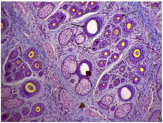 The skin cross-sectional samples were prepared following the protocol described by Yang et al. [14]. The skin sections were stained using a modified Sacpic method, following Nixon’s protocol [21]. The precise methodology for quantifying hair follicles has been explicated in our previous publication [20]. The indicators of the population of primary hair follicles included primary follicle density index (PFDI) and number (PFN). The indicators of the population of secondary hair follicles included the secondary follicle density index (SFDI), number (SFN), and S:P ratio. Indicators related to the population of active secondary hair follicles included ASFDI (active secondary follicle density index), ASFN (active secondary follicle number), Sf:P (ratio of active secondary follicles to primary follicles), and PASF (percentage of active secondary follicles). The typical structure of hair follicles in the skin of cashmere goats is depicted in Figure 1.