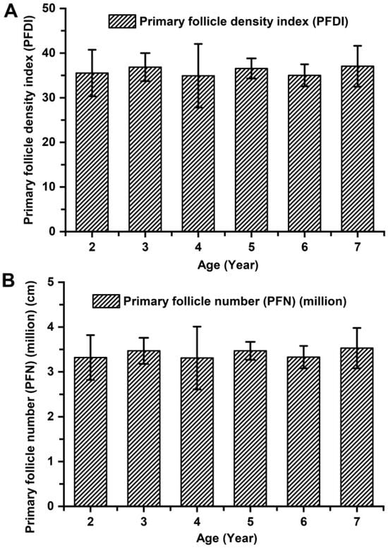 The population of primary hair follicles among cashmere goats aged 2 to 7 years. (A) Primary follicle density index among cashmere goats aged 2 to 7 years. (B) Primary follicle number among cashmere goats aged 2 to 7 years.