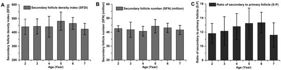 The population of secondary hair follicles among cashmere goats aged 2 to 7 years. (A) Secondary follicle density index among cashmere goats aged 2 to 7 years. (B) Secondary follicle number among cashmere goats aged 2 to 7 years. (C) Ratio of secondary to primary follicle among cashmere goats aged 2 to 7 years.