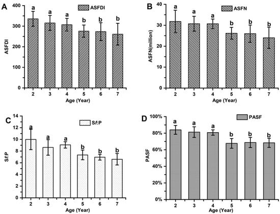 The indicators associated with the primary hair follicle population (PFDI and PFN), showed no significant differences among cashmere goats aged 2 to 7 years old (p > 0.05; Figure 3). The average values of PFDI and PFN in cashmere goats aged 2 to 7 years old were recorded as 35.87 ± 4.36 and 3.39 ± 0.43, respectively. Similarly, there were no significant differences observed in the indicators associated with the secondary hair follicle population (SFDI, SFN, and S:P) (p > 0.05; Figure 4). Additionally, the mean values of SFDI, SFN, and S:P in cashmere goats aged between 2 to 7 years old were determined as follows: SFDI, 449.35 ± 56.50; SFN, (42.31 ± 3.67) million; S:P, 12.55 ± 1.80. The indicators associated with the active secondary hair follicle population, including ASFDI, ASFN, PASF, and Sf:P, showed significant variations (p < 0.05; Figure 5). The ASFDI of cashmere goats aged 2–4 years was found to be 18.23% higher (319.35 ± 34.46 vs. 270.10 ± 41.99) compared to that of cashmere goats aged 5–7 years (p < 0.05). Additionally, the younger age group (aged 2–4 years old) exhibited a significantly higher ASFN and PASF by 22.38% (31.06 ± 3.73 vs. 25.38 ± 4.01) and by 20.15% (82.04 ± 5.00 vs. 68.28 ± 5.81), respectively (p < 0.05). Furthermore, the Sf:P ratio in cashmere goats aged 2–4 years was 32.47% higher (9.22 ± 1.21 vs. 6.96 ± 0.77) compared to those aged 5–7 years (p < 0.05).