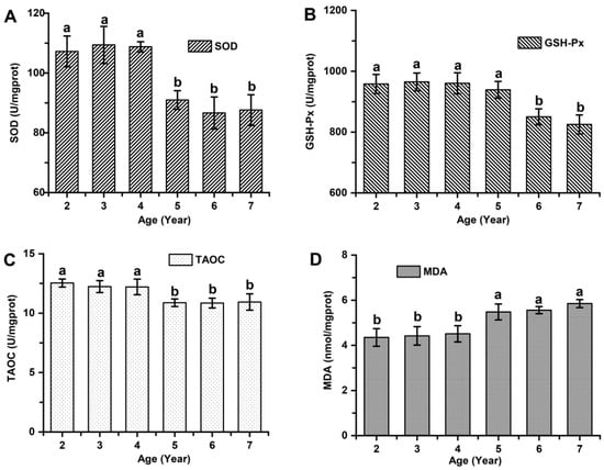 Skin antioxidant capacity and oxidative damage among cashmere goats aged 2 to 7 years old. (A) The activity of SOD enzyme among cashmere goats aged 2 to 7 years old. (B) The activity of GSH-Px enzyme among cashmere goats aged 2 to 7 years old. (C) The level of TAOC among cashmere goats aged 2 to 7 years old. (D) The content of MDA among cashmere goats aged 2 to 7 years old. No significant differences (p > 0.05) between groups are indicated by marking the same letter a or b, while the significant differences (p < 0.05) are indicated by marking different letters a and b.