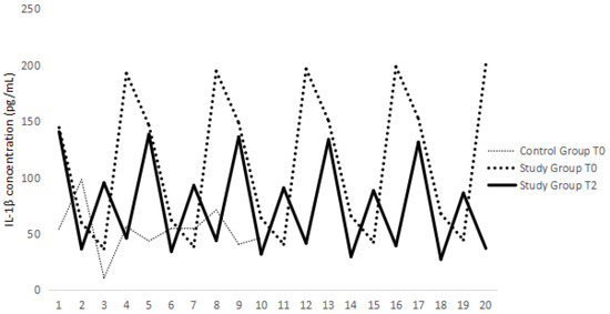 IL-1β (pg/mL) variations on the control group and the Study Group at T0 and T2.