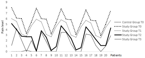 During clinical assessment, the pain level resulting from joint manipulation decreased in all SG patients, except for the same 3 patients, throughout the protocol. The pain level during knee manipulation followed a normal distribution at all time points: T0 (p = 0.09), T1 (p = 0.68), T2 (p = 0.47), and T3 (p = 0.47). In the SG, 15 animals showed improvement in pain level at T1 (first re-evaluation), 3 animals only at T2, and 2 animals showed no improvement at T3 (Figure 3).