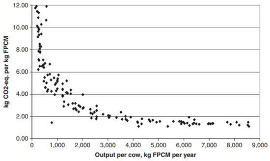 The relationship between total greenhouse gas intensity and output per cow. Each dot represents a separate country. FPCM—fat- and protein-corrected milk. While individual countries were not identified, milk yield per cow was below 1000 kg/cow/year for countries within sub-Saharan Africa and south and southeast Asia, and above 3000 kg/cow/year for countries within North America, western Europe, eastern Europe, and Oceania. Taken from Gerber et al. [75]. Copyright clearance under license number 5741800369452 provided by Elsevier.