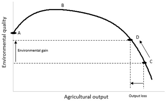 General relationship describing conflicts between product output (x-axis) and environmental outcomes (y-axis) in agriculture. Point A equates to no agricultural activity; between points A and B, environmental and agricultural outcomes both improve; C equates to a point where all incentives favour agricultural output and activity intensifies without counter-balancing environmental incentives; point D is reached when societal demands for environmental protection outweigh relatively small gains in further agricultural intensification. Taken from McInerny [153]. Reproduced with permission published by Cambridge University Press (License number 5778780809075).