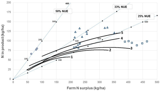 An analysis of physical data from 380 New Zealand dairy farms showed farm N surpluses ranging from 50 to 400 kg N/ha per year and NUE ranging mostly between 25% and 33% but with some markedly lower than 25% (solid lines in Figure 3). Similar numbers and intensification trends have been reported for pasture-based dairy farms in Australia [159]. Comparable experimental data from New Zealand farm systems studies reported by Macdonald et al. [160] showed generally higher amounts of N in product than the NZ farm data (higher milk production) and N surpluses in the range of 200 to 450 kg N/ha/year (open symbols in Figure 3).