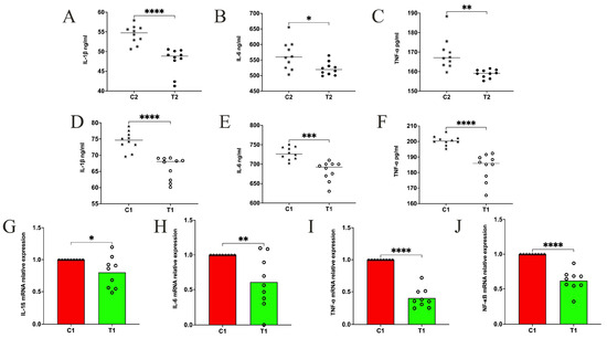 The serum test results showed that the IL–1ß, IL–6, and TNF–α level of group C2 pregnant sows was significantly higher than that of group T2, with an extremely significant difference (p < 0.0001, p < 0.05, and p < 0.01) (Figure 1A–C). The IL–1, IL–1ß, and TNF–α levels in the serum of group C1 were significantly higher than those in group T1 (p < 0.0001, p < 0.001, and p < 0.0001) (Figure 1D–F). The mRNA detection results showed that the relative expression levels of IL–1ß, IL–6, TNF–α, and NF–κB mRNA in group T1 were significantly reduced compared with those in group C1 (p < 0.05, p < 0.01, p < 0.0001, and p < 0.0001) (Figure 1G–J).
