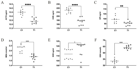 Serum factors of stress in piglets. (A) Adrenocorticotropic hormone (ACTH). (B) Cortisol (COR). (C) Epinephrine (EPI). (D) Malondialdehyde (MDA). (E) Superoxide dismutase (SOD). (F) Glutathione (GSH). n = 10. * p < 0.05, ** p < 0.01, and **** p < 0.0001.
