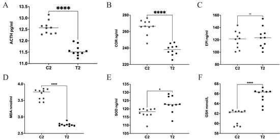 Serum factors of stress in sows. (A) Adrenocorticotropic hormone (ACTH). (B) Cortisol (COR). (C) Epinephrine (EPI). (D) Malondialdehyde (MDA). (E) Superoxide dismutase (SOD). (F) Glutathione (GSH). n = 10. ns p > 0.05, * p < 0.05, and **** p < 0.0001.