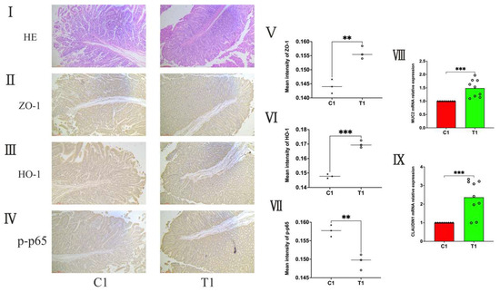 After performing HE staining on piglet duodenal tissues (Figure 4I), we found that the arrangement of villous epithelial cells in weaned piglets was relatively loose, and some epithelial cells were shed. In contrast, the villous epithelial cells in piglets fed with composite probiotics were arranged more tightly, and the villous structure was relatively complete. Immunohistochemical results showed that the mean optical density of ZO–1, a tight junction protein, was significantly higher in group T1 compared to group C1 (p < 0.01) (Figure 4II,V); the mean optical density of HO–1, an antioxidant protein, was also significantly higher in group T1 compared to group C1 (p < 0.01) (Figure 4III,VI); and the mean optical density of p–p65, a protein associated with inflammation, was significantly lower in group T1 compared to group C1 (p < 0.01) (Figure 4IV,VII). mRNA detection results of MUC2 and Claudin 1, proteins associated with mucus and tight junctions, respectively, showed that the mRNA expression of both genes in the duodenal tissues of piglets in group T1 were significantly higher than those in group C1 (p < 0.001) (Figure 4VIII,IX).