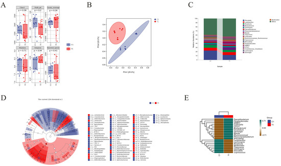 Analysis of sows’ fecal microbiota. (A) α−diversity analysis. (B) Principal co−ordinates analysis (PCoA). (C) Community bar plots at the genus level. (D) Taxonomic cladogram of linear discriminant analysis effect size (LefSe) analysis. (E) Cluster heatmap analysis of the top 20 differentially abundant genera. n = 10.