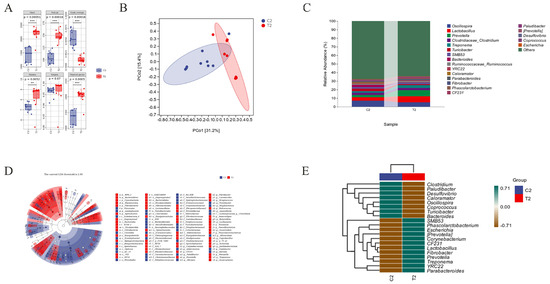 Subsequently, we investigated the fecal microbiota of weaned piglets and pregnant sows. The Chao1, Faith-pd, Good-coverage, Shannon, Simpson, and Observed-species indices exhibited no significant changes (p > 0.05) in the weaned piglet test group (T1) compared with the control group (C1), and there was no difference in α–diversity analysis between the two groups (Figure 5A). In contrast, the Chao1, Faith–pd, and Observed–species indices in the treatment group (T2) were significantly higher than those of the control group (C2) (p < 0.001), while the Shannon index was significantly higher in T2 compared to C2 (p < 0.001). The Good–coverage index was significantly lower in T2 than C2 (p < 0.001), and there were no significant differences between the Simpson indices in T2 and C2 (p > 0.05) (Figure 6A). The β–diversity principal coordinate analysis results showed that the C1 and T1 samples were widely separated, and that the microbial community structures were significantly different between the two groups (Figure 5B). The distances between the C2 and T2 groups were also distinguishable, and their microbial compositions were different (Figure 6B). The species composition results at the genus level showed that the abundance of prevotella, lactobacillus, roseburia, oscillospira, treponema, coprococcus, and lachnospira was higher in the C1 group than in the T1 group. Conversely, phascolarctobacterium, blautia, collinsella, ruminococcaceae_ruminococcus, parabacteroides, SMB53, CF231, clostridiaceae_clostridium, and gemmiger showed lower abundance in the C1 group and higher abundance in the T1 group (Figure 5C). Lactobacillus, prevotella, treponema, ruminococcaceae_ruminococcus, YRC22, parabacteroides, fibrobacter, phascolarctobacterium, and CF231 displayed higher abundance in the T2 group than in the C2 group, while oscillospira, turicibacter, bacteroides, caloramator, paludibacter, desulfovibrio, and coprococcus exhibited lower abundance in the T2 group compared to C2 (Figure 6C). The LEfSe analysis results showed that (Figure 5D): the annotated differential phyla in group T1 were firmicutes and actinobacteria, while in group C1, the annotated differential phyla were spirochaetes, proteobacteria, TM7, deferribacteres, and cyanobacteria. At the class level, the annotated differential taxa in group T1 were erysipelotrichi and coriobacteriia, while in group C1, they were spirochaetes, betaproteobacteria, TM7–3, verrusco–5, epsilonproteobacteria, deferribacteres, and mucispirillum. At the order level, the annotated differential taxa in group T1 were erysipelotrichales, coriobacteriales, i025, and rhodospirillales, while in group C1, they were spirochaetales, tremblayales, CW040, GMD14H09, pasteurellales, elusimicrobiales, campylobacterales, sphaerochaetales, mycoplasmatales, and deferribacterales. At the family level, the annotated differential taxa in group T1 were erysipelotrichaceae, S24–7, chitinophagaceae, and peptostreptococcaceae, while in group C1, they were prevotellaceae, spirochaetaceae, F16, RF16, pasteurellaceae, RFP12, elusimicrobiaceae, heliconacteraceae, sphaerochaetaceae, mycoplasmataceae, and deferribacteraceae. At the genus level, the annotated differential taxa in group T1 were gruhacterium, blautia, collinsella, veillonella, subdoligranulum, ruminococcus, gemniger, dorea, bulleidia, butyricimonas, adlercreutzia, lactococcus, coprobacillus, and sharpea, while in group C1, they were prevotella, coprococcus, streptococcus, lvsobacter, haemophilus, serratia, helicobacter, sphaerochaeta, mycoplasma, and acidaminococcus. The clustered heatmap of the top 20 differential taxa at the genus level showed an increased abundance of beneficial genera, such as faecalibacterium, parabacteroides, clostridium, blautia, and phascolarctobacterium in group T1 (Figure 5E). LEfSe analysis results revealed that (Figure 6D) in the feces of pregnant sows, the differentially abundant phyla in the C2 group were firmicutes, lentisphaerae, and synergistetes, while in the T2 group, they were bacteroidetes, cyanobacteria, elusimicrobia, fibrobacteres, and spirochaetes. At the class level, the differentially abundant classes in the C2 group were acidobacteria_6, clostridia, betaproteobacteria, synergistia, RF3, and opitutae, while in the T2 group, they were bacteroidia, 4C0d_2, elusimicrobia, fibrobacteria, erysipelotrichi, alphaproteobacteria, and spirochaetes. At the order level, the differentially abundant orders in the C2 group were turicibacterales, clostridiales, burkholderiales, desulfovibrionales, syntrophobacterales, synergistales, and ML615J_28, whereas in the T2 group, they were bacteroidales, elusimicrobiales, fibrobacterales, lactobacillales, erysipelotrichales, RF32, GMD14H09, sphaerochaetales, spirochaetales, and anaeroplasmatales. Furthermore, the differentially abundant families in the C2 group were rikenellaceae, carnobacteriaceae, turicibacteraceae, christensenellaceae, dehalobacteriaceae, eubacteriaceae, desulfovibrionaceae, syntrophobacteraceae, and synergistaceae, while in the T2 group, they were corynebacteriaceae, chitinophagaceae, prevotellaceae, RF16, S24_7, elusimicrobiaceae, fibrobacteraceae, lactobacillaceae, streptococcaceae, veillonellaceae, erysipelotrichaceae, alcaligenaceae, sphaerochaetaceae, spirochaetaceae, and anaeroplasmataceae. At the genus level, the differentially abundant genera in the C2 group were adlercreutzia, butyricimonas, paludibacter, alistipes, turicibacter, mogibacterium, sedimentibacter, clostridium_celatum, dehalobacterium, anaerofustis, clostridium, allobaculum, comamonas, oxalobacter, serratia, and synergistes, whereas in the T2 group, they were corynebacterium, CF231, prevotella, fibrobacter, lactobacillus, streptococcus, helcococcus, sarcina, anaerostipes, butyrivibrio, lachnospira, roseburia, faecalibacterium, anaerovibrio, phascolarctobacterium, bulleidia, coprobacillus, sutterella, janthinobacterium, moraxella, sphaerochaeta, trepon