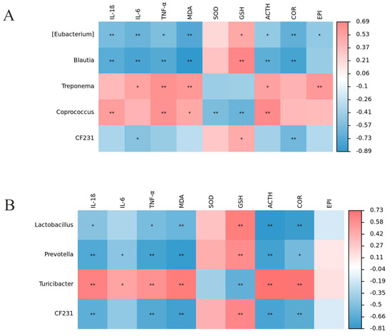 In order to further investigate the influence of fecal microbiota on oxidative stress in weaned piglets’ pregnant sows, we performed association analysis between the differential microbiota aa? t the genus level of the top 20 abundant genera and serum indicators. The results of fecal microbiota association analysis in weaned piglets showed that blautia was significantly negatively correlated with IL–1ß, IL–6, TNF–α, MDA, ACTH, COR, and significantly positively correlated with GSH. Treponema was significantly positively correlated with IL–6, TNF–α, MDA, ACTH, and EPI. Coprococcus was significantly positively correlated with IL–1ß, TNF–α, MDA, and ACTH and significantly negatively correlated with SOD and GSH. CF231 was significantly negatively correlated with IL-6 and COR and significantly positively correlated with GSH (Figure 7A). The results of fecal microbiota association analysis in pregnant sows showed that lactobacillus was significantly negatively correlated with IL–1ß, TNF–α, MDA, ACTH, COR, and significantly positively correlated with GSH. Prevotella was significantly negatively correlated with IL–1ß, IL–6, TNF–α, MDA, ACTH, COR, and significantly positively correlated with GSH. Turicibacter was significantly positively correlated with IL–1ß, IL–6, TNF–α, MDA, ACTH, COR, and significantly negatively correlated with GSH. CF231 was significantly negatively correlated with IL–1ß, TNF–α, MDA, ACTH, COR, and significantly positively correlated with GSH (Figure 7B).
