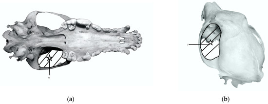 This study shows that in all examined specimens of the Carnivora order, the ratio between the surface of the masseter and the surface of the temporal muscle is 50–33% smaller on average for all examined specimens. A larger surface and muscle mass of the temporal muscle lead to its greater strength. The author’s own studies do not support this thesis. Analysis of data showed that in tigers, the masseter muscle surface was larger (by 5.45%, on average) or equal to that of the temporalis. Similar results were found in foxes (11.84%) and wolves (5.01%). The values observed may be linked to a larger length–height ratio of the skull. This observation is worth noting and analysing in future studies since a large skull and body size do not necessarily implicate a large volume of masticatory muscles, as was found when examining the skulls of bears. Similar conclusions about the size of masticatory muscles were reached by van der Meiden et al. [28] in a study of bite forces in lions and tigers using an in vivo method. Their results indicated that bite forces were higher than those predicted by the dry skull measurement method [3,16,23]. It was concluded that this underestimation of results was due to a flaw in the dry skull measurement method. It is an error that overestimates the physiological cross-sectional area of the masseter muscle and underestimates the physiological area of the temporalis muscle. It is also recommended to standardise the methodology of measurements of the masticatory muscles used to calculate BF. In the measurements used to determine BF, the areas of the masticatory muscles were measured at the point of their greatest thickness, stimulating the extent of these areas (comparing diagrams and photos) in different authors [1,15,17,19]. Therefore, it is possible that there are differences in the average dimensions of the areas of individual muscles.