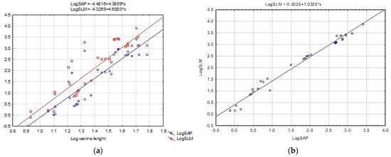 The relationship between bite force and body mass in the studied carnivoran families is allometric. That is why bite force values do not increase with body mass. For this reason, the bite force quotient (BFQ) was used to compare bite forces between different animal species. This value allows comparison of bite forces in species with different body sizes. In the present study, the Christiansen, Wroe, and Hite methodology [16,17] was used to calculate the BFQ. The bite force quotient was calculated from equations of the residuals of a regression analysis of the estimated bite forces at the tip of the canine and middle of the breaker tooth, respectively, to the estimated body weights. The following formula was used: