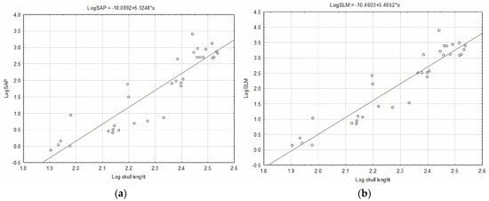 Log–log plot of (a) bending strength in AP direction; (b) LM direction to skull length.
