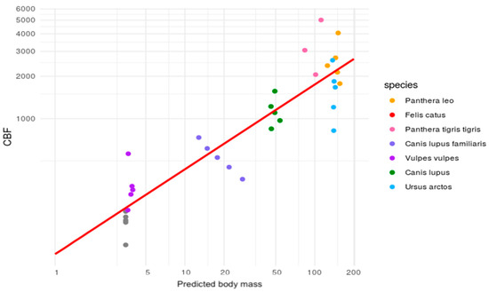 The authors’ study also found a surprisingly high BFQ for the red fox, which differs from other publications. This difference may be due to the fact that the BFQ depends on the entire group on which the regression was performed. It should be noted that many species may change the relationships between specific groups compared to the same analysis of a smaller number of species. This observation is supported by Figure 5.