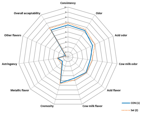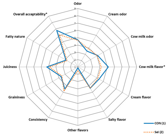 The results of the sensory profiles of the fresh cheeses are exhibited in Figure 1. Fresh cheeses produced with milk obtained from the batch supplemented with organic Se and I (SeI) had a milder cow milk flavor (p < 0.05) and lower overall acceptability value (p < 0.05).