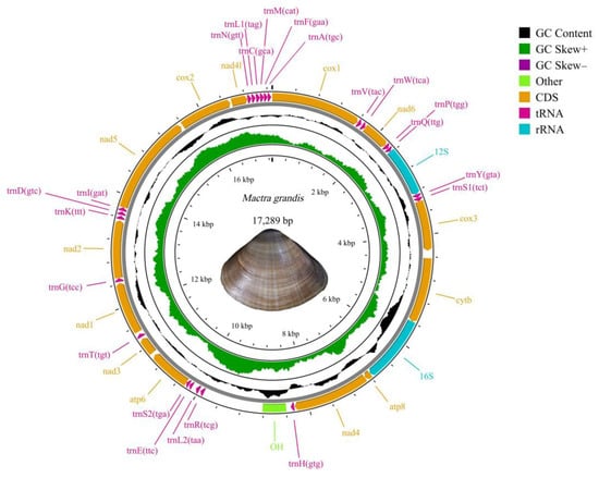 The raw sequencing data for Mactra grandis mitogenome included 19,544,316 reads and a total base of 2,951,191,716 bp, with Q20 and Q30 values being 96.72% and 94.21%, respectively. Altogether, 19,344,846 high-quality reads with 2,913,422,642 bp were obtained, accounting for 98.97% of the whole reads. After assembly and annotation, the complete mitochondrial genome of Mactra grandis showed a double-stranded circular molecule structure and had 17,289 bp in length (GenBank accession no. OR897711, Figure 1). The mitogenome had the typical gene organization of Mactridae [15], including 13 PCGs (cox1, cox2, cox3, cytb, nad1, nad2, nad3, nad4, nad4l, nad5, nad6, atp6, and atp8), two rRNA genes (12S and 16S), and 22 tRNAs (Table 1). The nucleotide composition was 24.90% for A, 23.32% for G, 12.14% for C, and 39.64% for T, exhibiting an obvious (A + T)-bias of 64.54%. All the functional genes were encoded on the heavy strand.