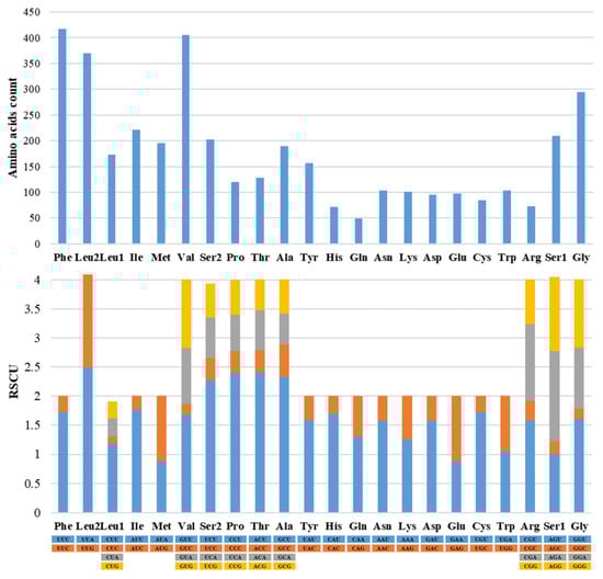 The relative synonymous codon usage (RSCU) of Mactra grandis mitogenome indicated Phe, Val, and Leu were the three most frequently used amino acids (417, 405, and 370 counts, respectively) (Figure 2). Consistent with other mactrid mitogenomes, NNU and NNA were dominant in most codons, indicating a preferred sequence ending with A or T. UUA-Leu2, UCU-Ser2, CCU-Pro, ACU-Thr, and GCU-Ala were the five most frequently used codons. All five codons had RSCU values over 2.