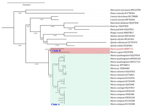 The best partitioning scheme in this study had 164 params, 18,324 sites, and 10 subsets, with InL and AICc being −221,561.8095703125 and 443,454.599481, respectively. The best evolutionary models were listed in Table 2. Phylograms derived from ML and BI analyses had identical topologies, suggesting that the family Mactridae was subdivided into two main clades (Figure 3, PP = 1, BS = 100). One clade covered only Mactra species, including eighteen mitochondrial genome sequences from 7 species and a cryptic species in Mactra antiquata. The newly sequenced species, Mactra grandis, clustered with Mactra cygnus, demonstrating a sister relationship (Clade B). Other Mactra species clustered to Clade A, including Mactra quadrangularis, Mactra sp., Mactra chinensis, Mactra antiquata, the cryptic species in Mactra antiquata, and Mactra cumingii, with the first five species having two or more sequences. Although markedly morphologically different from Mactra antiquata, Mactra cumingii occupied the phylogenetic position to divide the Mactra antiquata mitogenomes into two types, which supported the existence of a cryptic species in Mactra antiquata [2,43]. The other ten Mactridae species from 6 genera constituted another main clade, including four genera from subfamily Mactrinae (Mactrinula, Rangia, Mulinia, and Spisula), one genus from subfamily Lutrariinae (Lutraria), and one family from subfamily Anatinellidae (Raeta). Our results provided support for removing Mactrinula, Rangia, Mulinia, and Spisula out from subfamily Mactrinae [15]. Two Raeta species first clustered with Mactrinula dolabrata, prompting the attribution of Raeta to family Mactridae instead of Anatinellidae [44]. Results also showed that all congeneric species in Mactridae clustered together, indicating closer relationships.