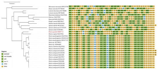 Phylogenetic trees were reconstructed using Bayesian inference (BI) and maximum likelihood (ML) analyses. Bayesian inference phylogenies were inferred using MrBayes 3.2.6 [31] under partition model (2 parallel runs, 200,000 generations), in which the initial 25% of sampled data were discarded as burn-in. Maximum likelihood phylogenies were inferred using IQ-TREE [32] under an edge-linked partition model for 5000 ultrafast bootstraps [33], as well as the Shimodaira–Hasegawa–like approximate likelihood-ratio test [34]. Phylogenetic trees and gene arrangements were visualized using the Interactive Tree of Life [35]. The branch support values of Bayesian posterior probabilities (PP) and the maximum likelihood bootstrap support values (BS) were shown on the trees. The CREx algorithm was employed to reconstruct the putative gene order rearrangement events that might have transpired within the genus Mactra [36].