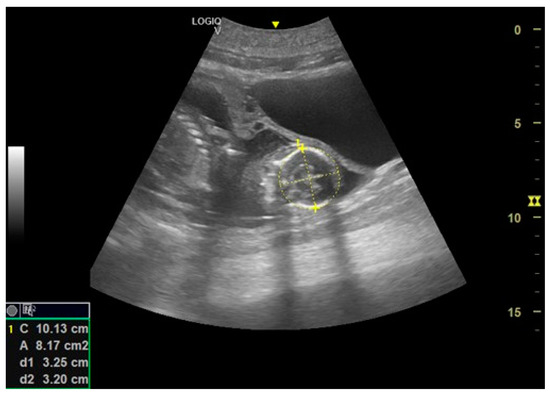 - Day 113 ± 4 post-ovulation: The embryonic vesicle was first recognizable in the uterine cavity as a roundish structure with an average diameter of 1.71 cm with an anechoic content. In addition, it is possible to recognize the embryo inside it as an elongated hyperechoic structure (Figure 2). Thanks to these findings, it has been possible to make a diagnosis of pregnancy.