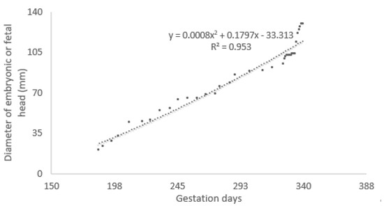 Authors considered and realized the growth curve of the fetal head diameter to describe a curve of correlation between fetal head diameter and gestation age. The major and minor axes of the maximum cross-section of the embryonic and fetal heads were considered. The diameter of the fetal head was calculated as half the value of the sum of these two axes [19] (Figure 9). From these results, authors estimated the following linear regression equation of the growth curve between the gestation age (the independent variable X) and the diameter of the fetal head (the dependent variable Y) (Figure 10):