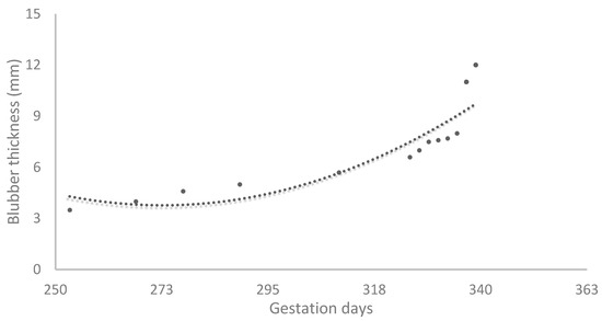 This growth curve shows that from around day 250 of gestation, the blubber thickness grows at an almost fixed rate until day 335. After day 335, the rate sharply increases.