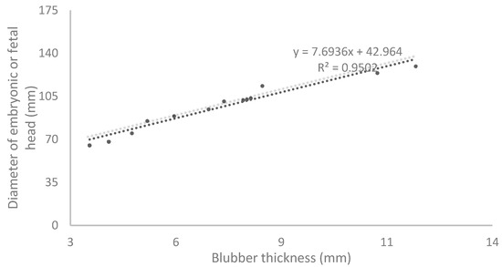 Furthermore, the blubber length and the diameter of the embryonic or fetal head are positively correlated (R2 = 0.9502, F-ratio significance level p < 0.0001) (Figure 12).