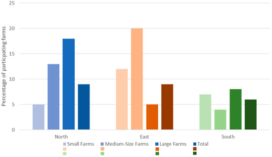 The finally realized farm size classes are shown in Table 1, and the final participation rate per region and class in Table 2 and Figure 1.