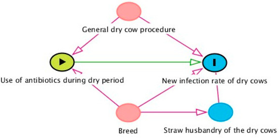 A causal diagram displayed as a directed acyclic graph in a prevalence study among 765 German dairy herds showing the example target variable “New infection rate of dry cows”, its influencing variable “Use of antibiotics during the dry period”, and the possible confounders.