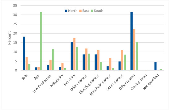 Figure 3 shows that infertility, udder diseases, and disorders of the locomotor system were the main reasons for culling. While in the region North, the proportion of animals sold for breeding was significantly higher than in the other two regions, the South showed a high proportion of animals that left due to old age. In the East, on the other hand, a higher proportion of animals left due to underperformance than in the other two regions. In all regions, the high proportion of cows for which “miscellaneous” was recorded as the reason for culling was striking.