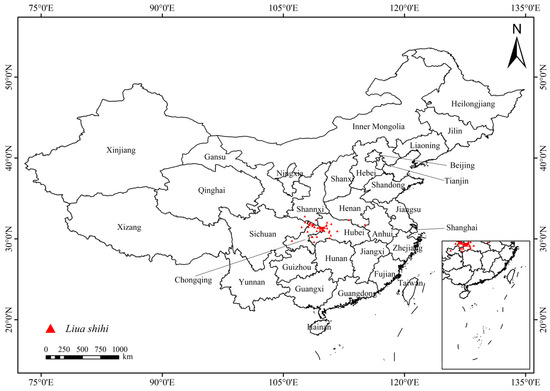 The following supporting information can be downloaded at: https://www.mdpi.com/article/10.3390/ani14091390/s1, Table S1: The distribution data of Liua shihi collected in published literatures; Table S2: The distribution data of Liua shihi collected on website; and Table S3: The distribution data of Liua shihi collected from field survey.