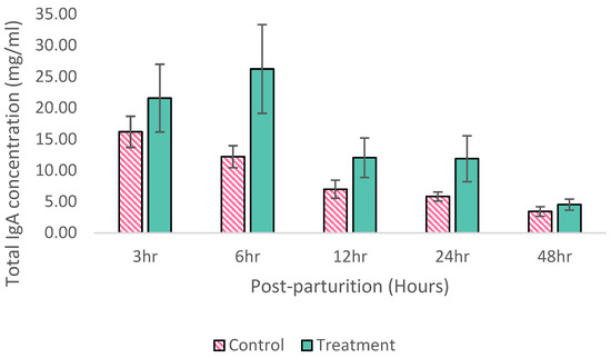 Immunoglobulin A (IgA) levels (means ± SE) in sow colostrum at 3, 6, 12, 24, and IgA in sow milk at 48 h after farrowing in control and the group of sows supplemented with probiotics; Treatment group.