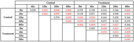 According to the clinical findings, none of the sows in either of the groups showed clinical signs of PED when they were kept in the farrowing house. However, their piglets started showing clinical signs of PED at 4 days old. The pig IgA levels in colostrum in the control and treatment groups are shown in Figure 1. In the treatment group, the highest level of IgA was found in the sows fed BACTOSAC-P™ at 6 h (26.22 ± 7.09 mg/mL), the lowest level was found at 24 h (11.87 ± 11.58 mg/mL) (p < 0.001), and the IgA level of 4.51 ± 2.84 mg/mL in sow milk was found. In the control group, the highest level of IgA was found at 3 h (16.16 ± 2.50 mg/mL), and the lowest level was found at 24 h (3.41 ± 2.44 mg/mL) (p < 0.001) and the IgA level of 3.41 ± 2.44 mg/mL was found in sow milk. According to the comparison between the total IgA levels in colostrum and milk across the different timepoints within and between the groups in Figure 2, the pig IgA levels in both the groups from 3 to 48 h were higher in the treatment group than in the control group, especially at 6 h (p = 0.10).