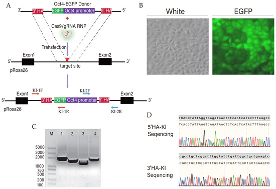 PK15 cells were electroporated with the ribonucleoprotein (RNP) complex and a donor template. The sequence of the sgRNA targeting the porcine ROSA26 locus was 5′-GTG AGA GTT ATC TGA CCG TA-3′ [31]. Briefly, for 1 × 106 cells, 10 μg Cas9 protein and 100 pmol sgRNA were pre-mixed for 10 min at room temperature, before adding 5 μg donor template and opti MEM (Gibco, Grand Island, NY, USA) up to a volume of 20 μL. Using a CUY21EDIT II electroporator (BEX Co., Ltd., Tokyo, Japan), the electroporation program was enacted as follows: voltage 200 V, duration 1 ms, and 5 pulses. After electroporation and the reseeding of transfected cells at a low cell density, PK15 cells were cultured for about 2 weeks to form single-cell colonies. The selected cell colonies were picked up for propagation in an independent well, and the knock-in pOCT4-EGFP in the pig ROSA26 site was PCR-amplified using primers, as shown in Supplementary Table S2-1, before being Sanger-sequenced to confirm the target DNA. The cell colonies with pOCT4-EGFP in the ROSA26 site in targeted genomic regions were selected for further functional assays.