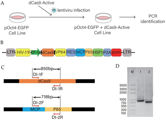 The dCas9-SAM system expressing dCas9-VP64 and MCP-P65-HSF1 elements was packaged as a lentivirus (Figure 3A,B). After infecting pOCT-EGFP cell lines with dCas9-SAM lentivirus, we confirmed that dCas9-SAM was stably integrated into the cell genome through PCR amplification and DNA sequencing (Figure 3C,D). In this way, we obtained a cell line that expresses both pOCT4-EGFP and dCas9-SAM systems simultaneously.