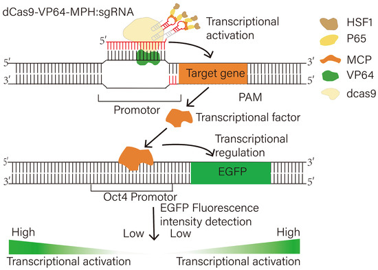 In this study, the Synergistic Activation Mediator (SAM) library, which contained a dCas9-VP64 fusion protein combined with a modified sgRNA and a trimeric fusion protein complex, was used to increase the expression of TFs. The modified sgRNA sequence contained two RNA hairpin aptamers recognized by the bacteriophage coat protein MS2. The trimeric fusion protein was made up of the MS2 protein for binding the sgRNA and two transcription activation domains from NF-jB (p65) and heat shock factor 1 (HSF1). Then, sgRNA binding with dCas9 was used to specifically identify and target the promoter of the target gene. The combination of the VP64, p65, and HSF1 activation domains synergistically increased the gene expression of the targeted TF. After the target TFs were translated into a transcription factor protein, they could bind to the OCT4 promoter region and upregulate or downregulate the expression of OCT4 (Figure 4). To detect the regulatory effects of transcription factors on OCT4, we constructed a porcine OCT4 promoter driving EGFP expression in the knock-in cell line, so the role of transcription factors can be identified according to changes in the fluorescence intensity of EGFP. If the intensity of green fluorescence was found to have increased, this would indicate that the transcription factors had an active effect on OCT4 expression. Conversely, if the intensity of green fluorescence decreased, this suggested that the activated transcription factors exerted an inhibitory effect on OCT4 expression (Figure 4).