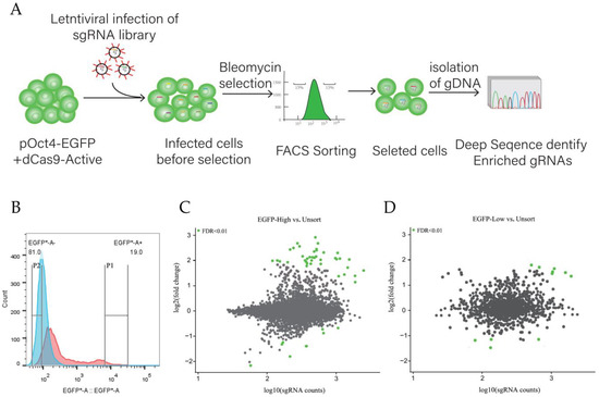 The lentiviral sgRNA library was transduced into pOCT4-EGFP cells expressing the dCas9-SAM system at an MOI of 0.3 to ensure that most cells received only one sgRNA. The cells infected with the virus were cultured in a carbon dioxide incubator at 37 °C and 5% CO2 for 24 h. After transduction for 2 days, 800 µg/mL bleomycin (Sigma, Shanghai, China) was added to screen and amplify the positive transduction cells for 7 days.