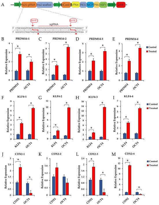 Verification of the transcriptional regulation of the OCT4 gene by CRISPR-activated transcription factors. (A) Schematic diagram of all-in-one CRISPR activation vector. (B–E) Verification of the transcriptional regulation of the OCT4 gene by CRISPR-activated PRDM14 gene with different sgRNAs. (F–I) Verification of the transcriptional regulation of the OCT4 gene by CRISPR-activated KLF4 gene with different sgRNAs. (J–M) Verification of the transcriptional regulation of the OCT4 gene by CRISPR-activated CDX2 gene with different sgRNAs.* p < 0.05.