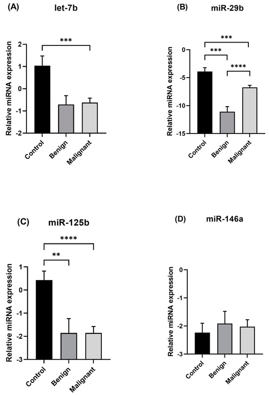 Relative expression levels of the miRNAs let-7b (A), miR-29b (B), miR-125b (C), and miR-146a (D) among benign lesions, malignant lesions, and the control group. Data are presented as −∆Ct mean values ± standard error of the mean (SEM). Statistical analysis was performed using Student’s t-test for normally distributed variables and Mann–Whitney U test for non-normally distributed variables. Significance was declared at p < 0.01 (**), p < 0.001 (***), and p < 0.0001 (****).