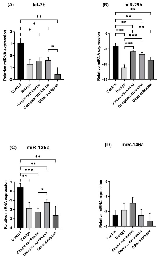 Relative expression levels of the miRNAs let-7b (A), miR-29b (B), miR-125b (C), and miR-146a (D) among benign lesions, simple, complex, and other subtypes carcinomas, and the control group. Data are presented as −∆Ct mean values ± standard error of the mean (SEM). Statistical analysis was performed using Student’s t-test for normally distributed variables and Mann–Whitney U test for non-normally distributed variables. Significance was declared at p < 0.05 (*), p < 0.01 (**), p < 0.001 (***).